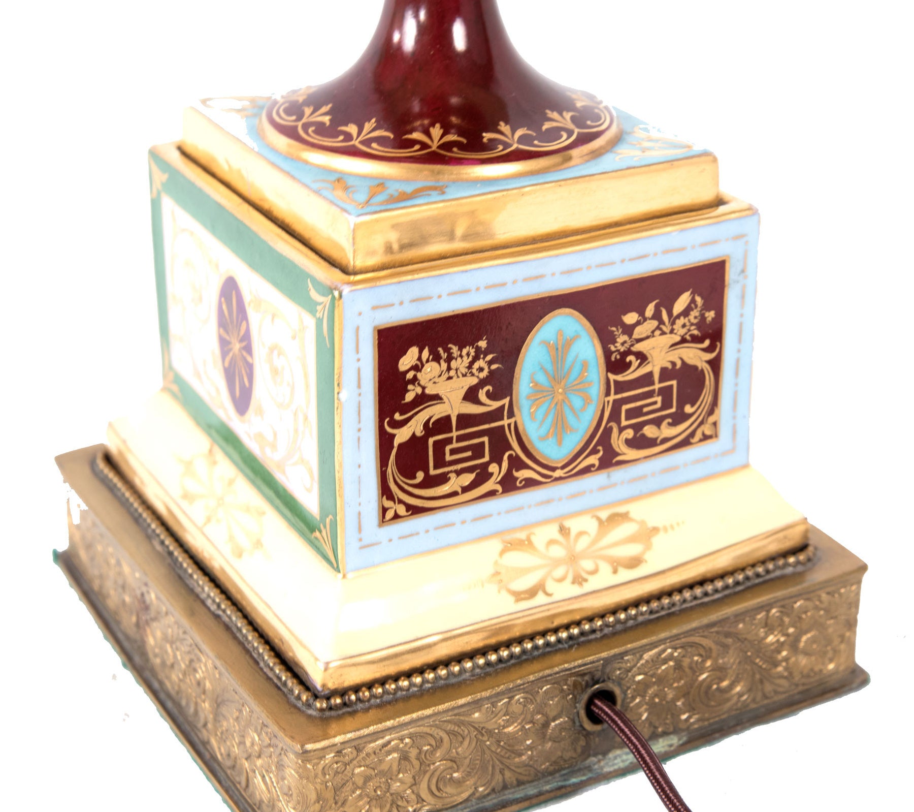 The urns rest on square plinths and gilt-bronze bases that underscore their neoclassical inspiration. By the late 19th century, Royal Vienna pieces such as these were sought after by collectors and connoisseurs across Europe for their union of painterly finesse, classical themes, and decorative luxury. Adapted with electrical fittings, the pair bridges traditional porcelain artistry with modern domestic use.