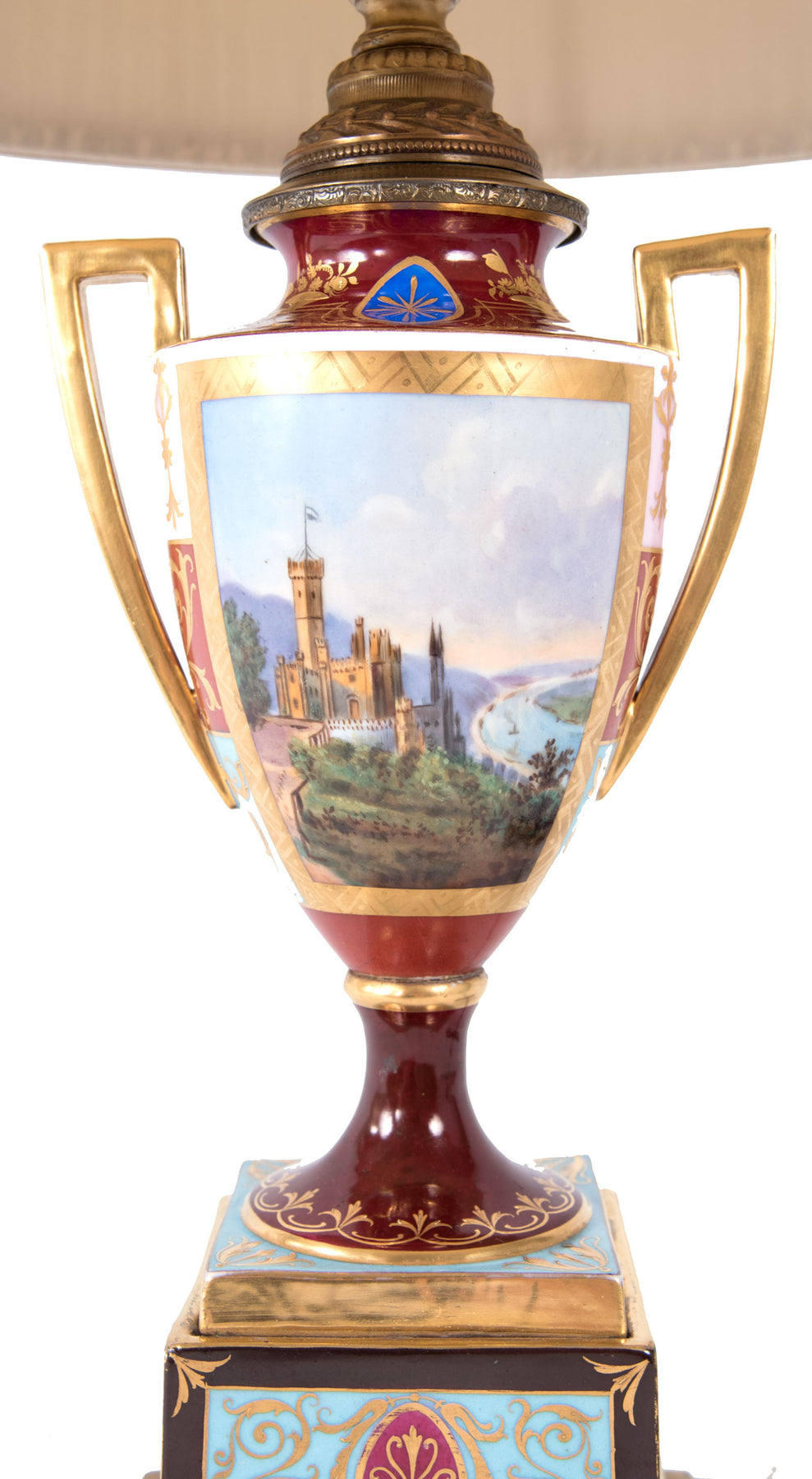 This pair of urns, later adapted as lamps, displays the hallmark style of Royal Vienna porcelain. Each vessel features finely rendered portrait medallions of allegorical women, framed by intricate gilt scrollwork and panels of polychrome enamel. Opposite sides show landscapes painted with equal precision, offering a balance of human beauty and natural scenery.