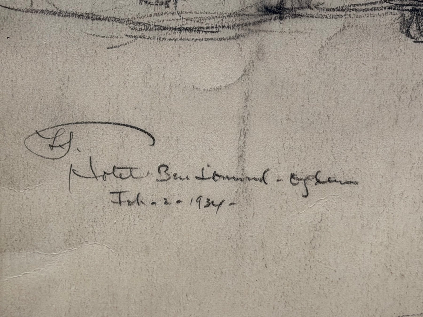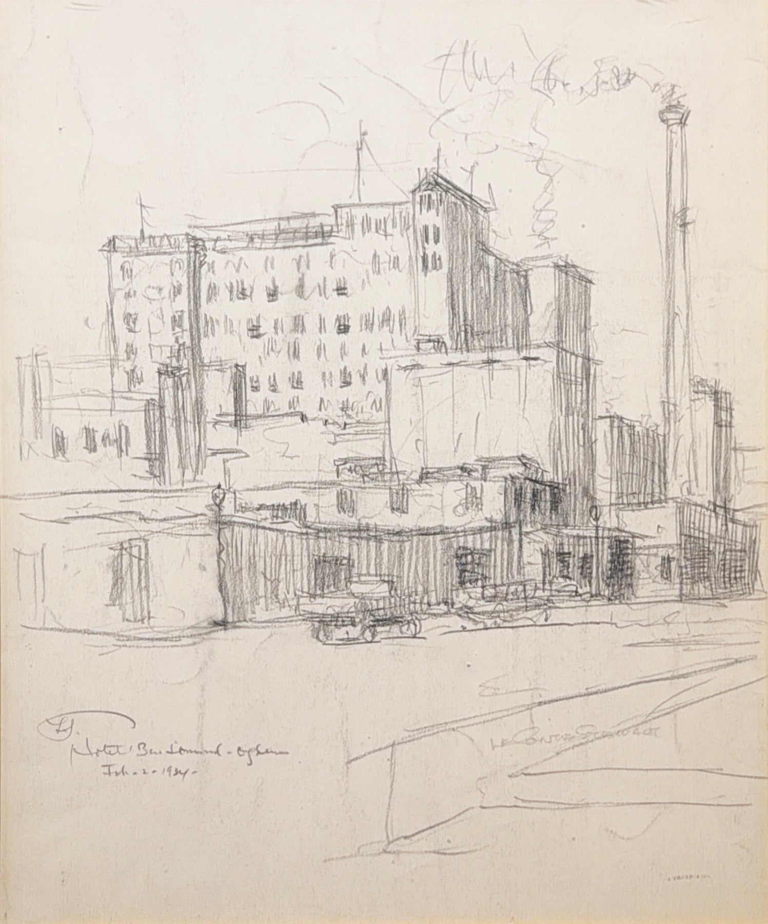 Drawn in 1934, Stewart’s brisk pencil lines capture the blocky massing and industrial energy of downtown Ogden, with the newly renamed Hotel Ben Lomond rising above the street. Originally built in 1927 as the Bigelow Hotel, the landmark was rechristened the Hotel Ben Lomond in 1933 and quickly became one of the city’s best-known addresses, closely tied to Ogden’s rail-era growth and commercial identity.