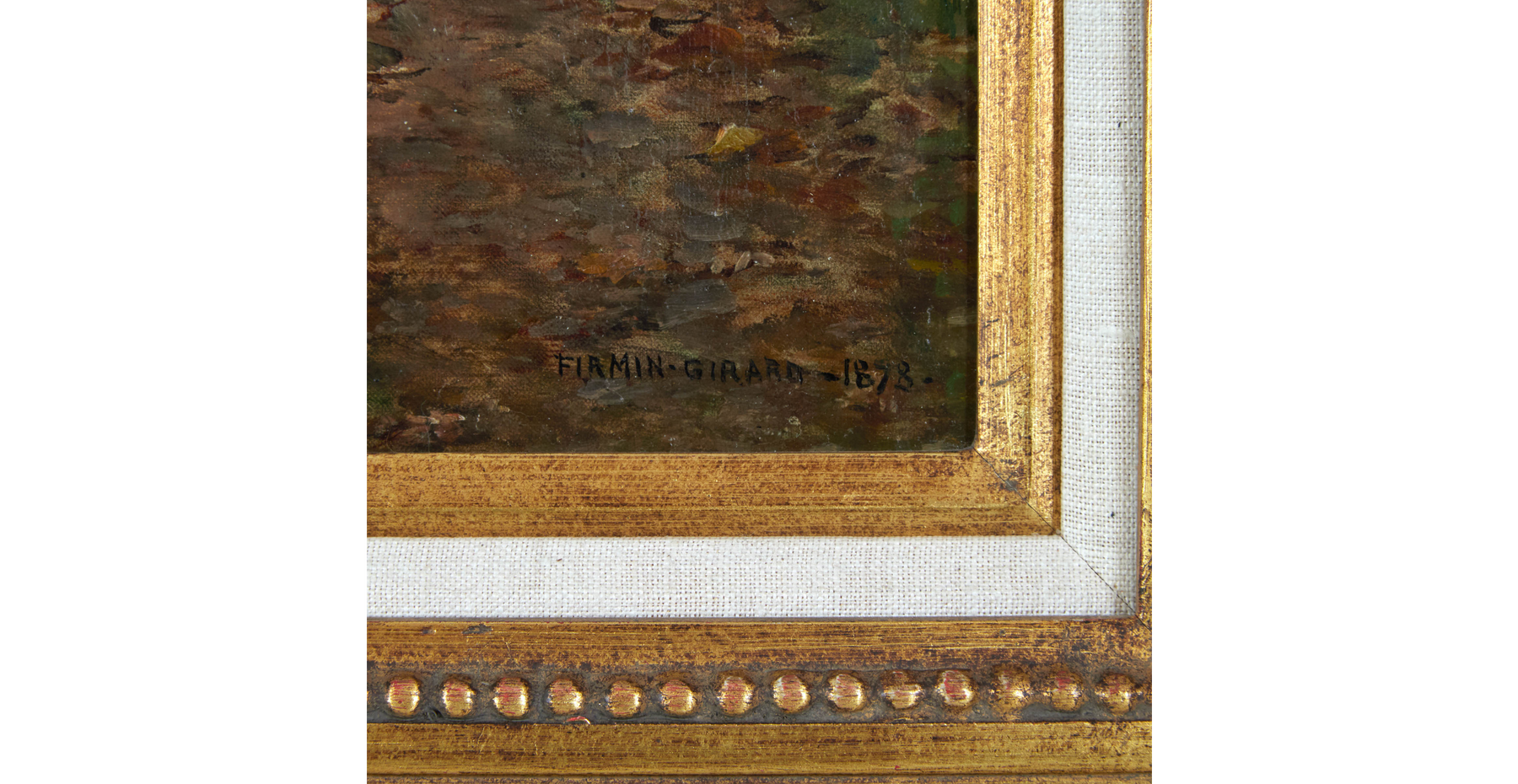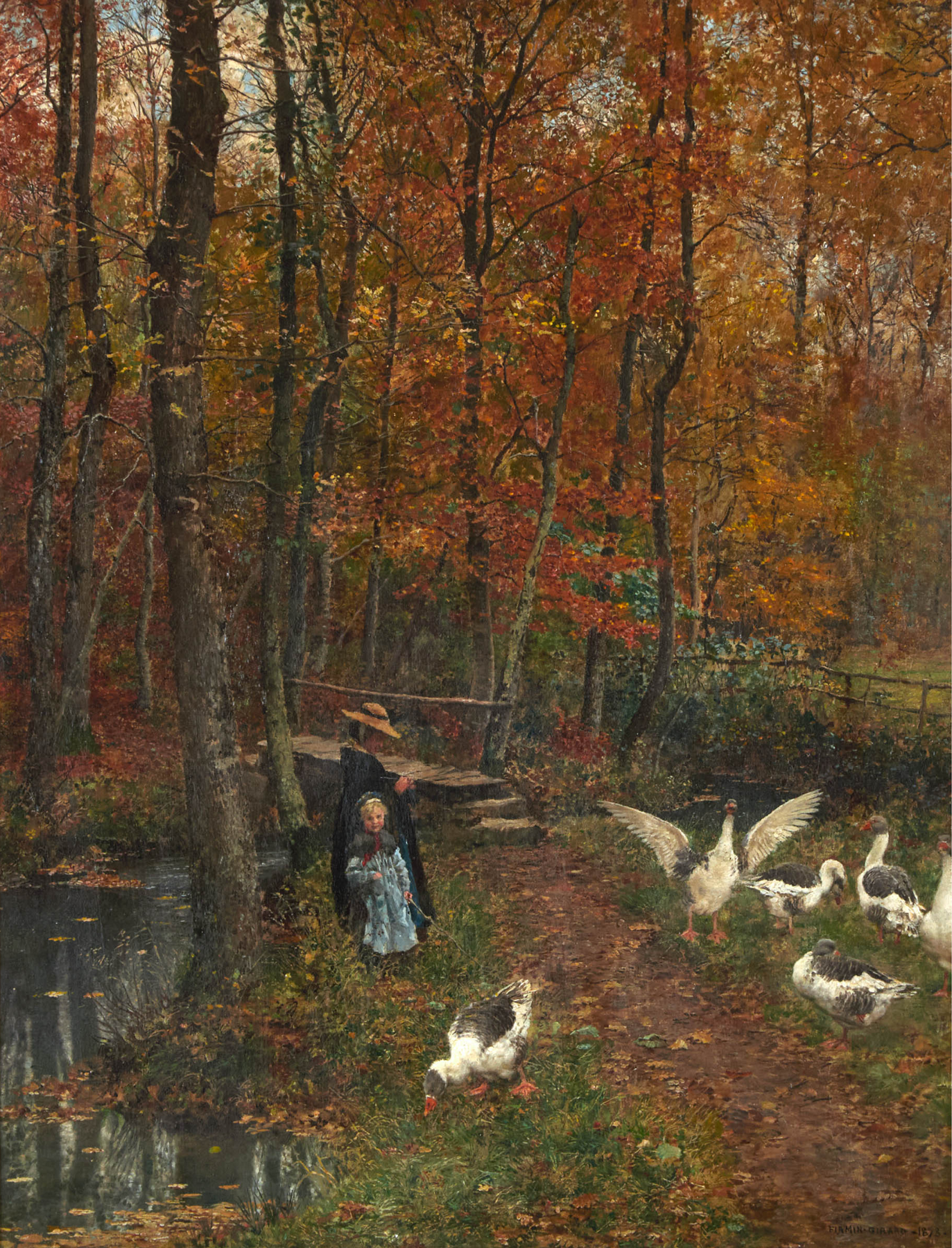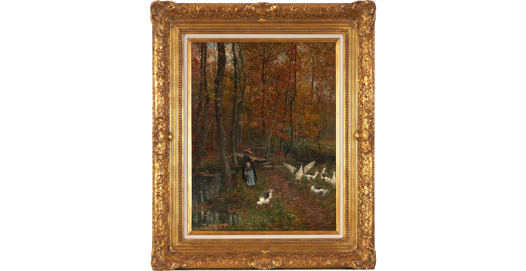 Set within a richly colored autumn woodland, Tending to the Geese presents a quiet rural moment in which a child pauses along a forest path as a flock of geese scatters and settles around her. Firmin-Girard balances narrative charm with close observation of nature: fallen leaves, reflective water, and filtered light anchor the scene in the rhythms of the countryside. The geese animate the composition, their movement guiding the viewer through the landscape and reinforcing themes of care, stewardship, and everyday labor.