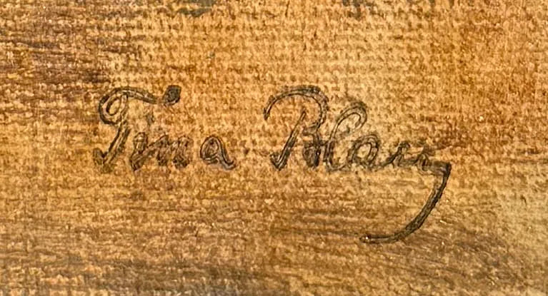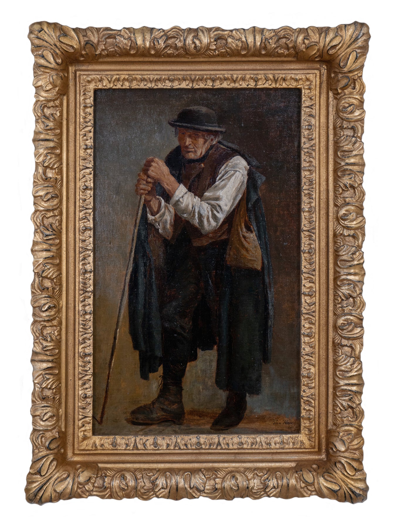 This portrait depicts an elderly traveler leaning heavily on his walking stick, his weathered features and humble clothing conveying both hardship and dignity. Blau’s sensitive handling of paint highlights the textures of fabric, skin, and wood, while her restrained palette emphasizes the somber, contemplative mood of the work.