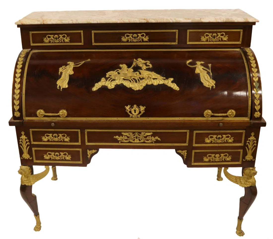 19th Century French Empire cylinder-top desk with extensive ormolu bronze mounts. The desk has a leathertop and leathertop pull outs on each side.