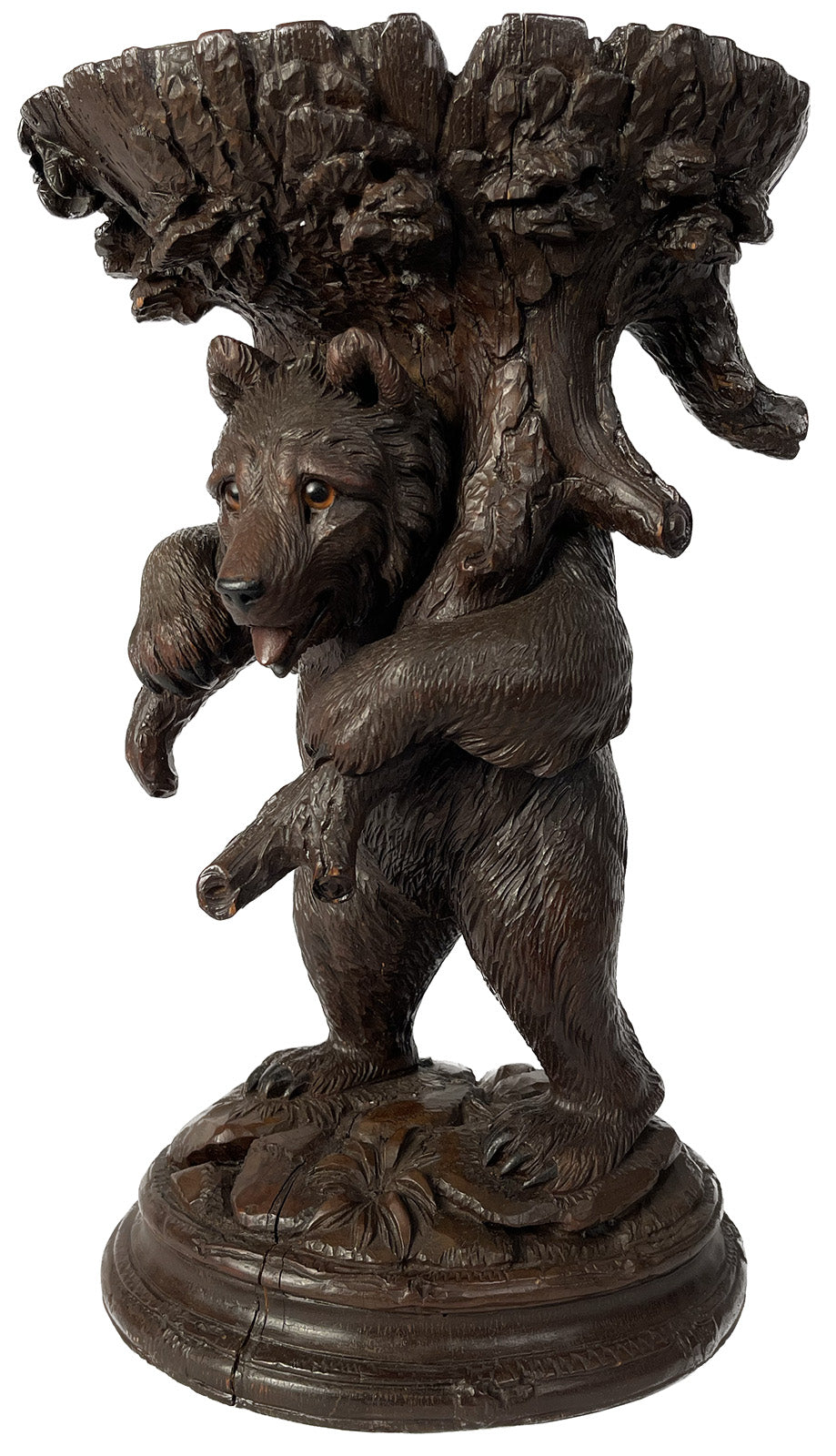 Animal subjects—particularly bears—were central to Black Forest woodcarving in the late 19th century, reflecting regional folklore, Alpine identity, and a romantic fascination with untamed nature. Intended as a decorative sculpture rather than functional furniture, this piece exemplifies the genre’s blend of technical virtuosity, humor, and reverence for the natural world, transforming a simple block of wood into a lively sculptural vignette.