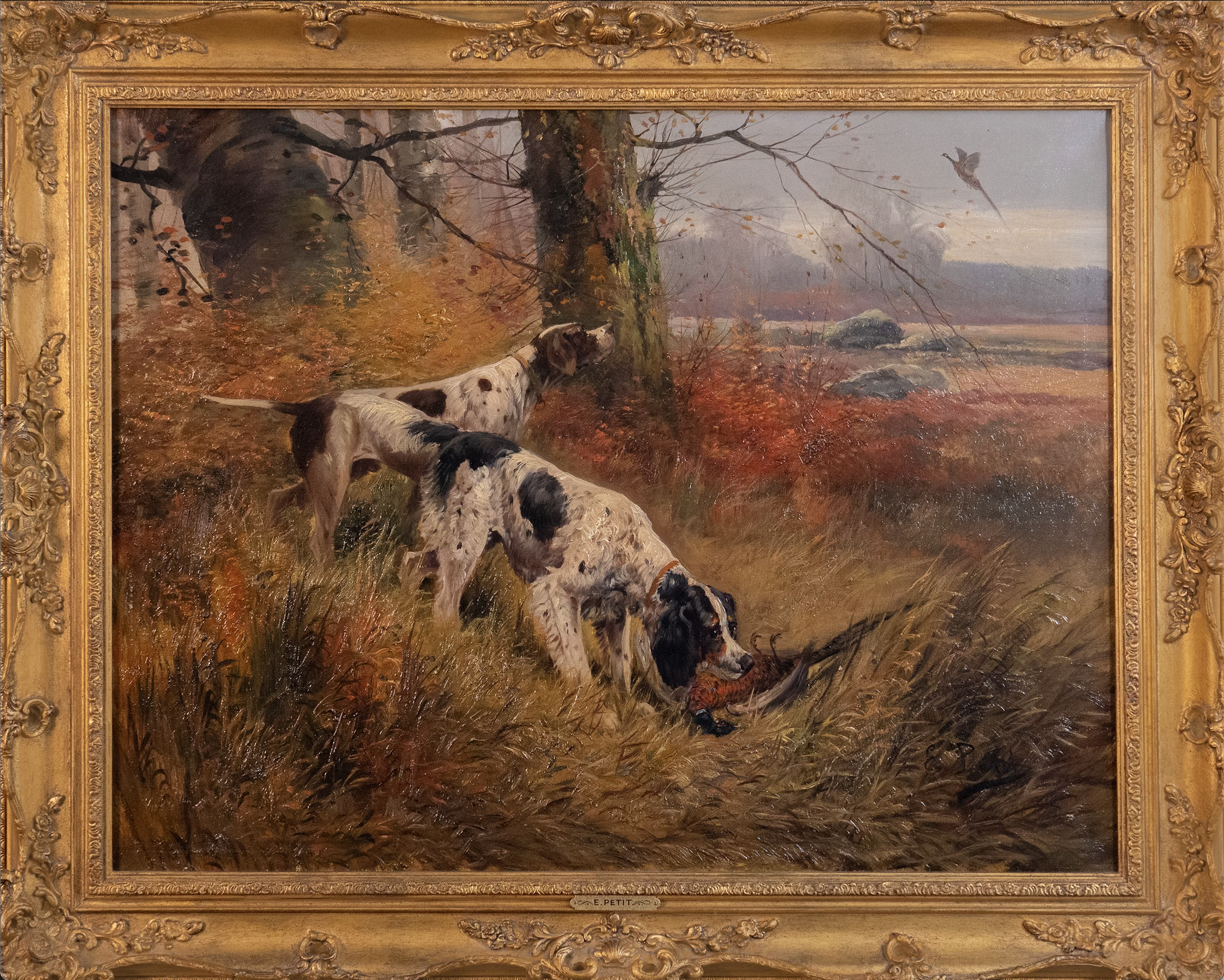 Eugène Petit, a French artist celebrated for his animal paintings, is best known for his evocative depictions of hunting dogs. His works capture the essence of his subjects with lifelike precision and an eye for movement and emotion. Petit's mastery of oil painting brought him recognition during his lifetime, and his art remains admired for its technical brilliance and timeless appeal.