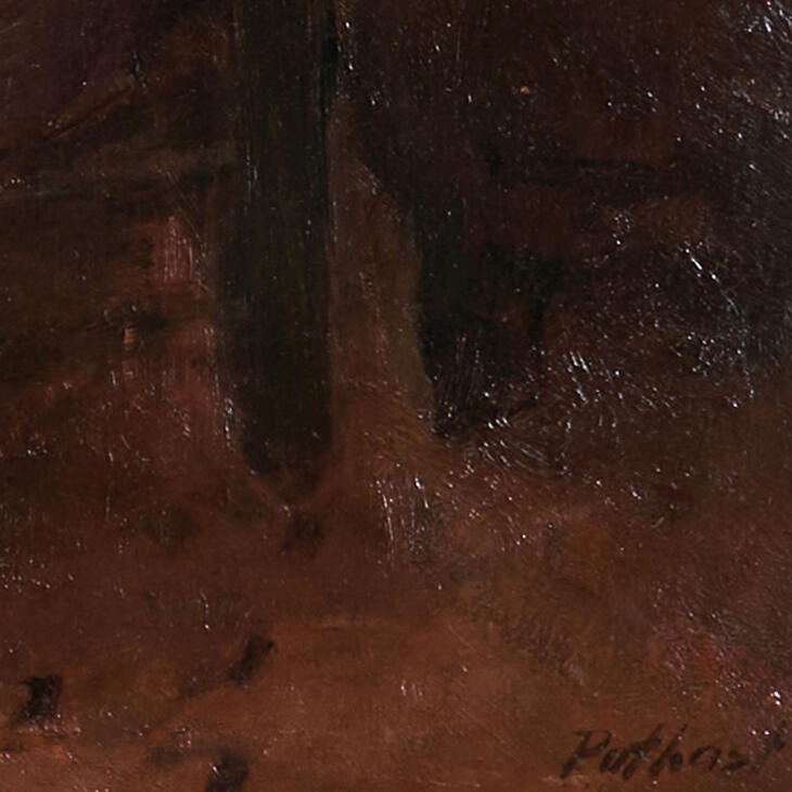 In this painting, Pothast’s masterful treatment of light and texture creates a tender atmosphere of maternal affection. The mother’s gentle gesture and the golden illumination filtering through the curtained window evoke both spiritual and everyday grace.