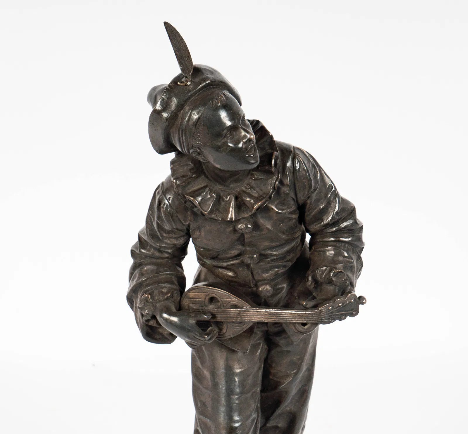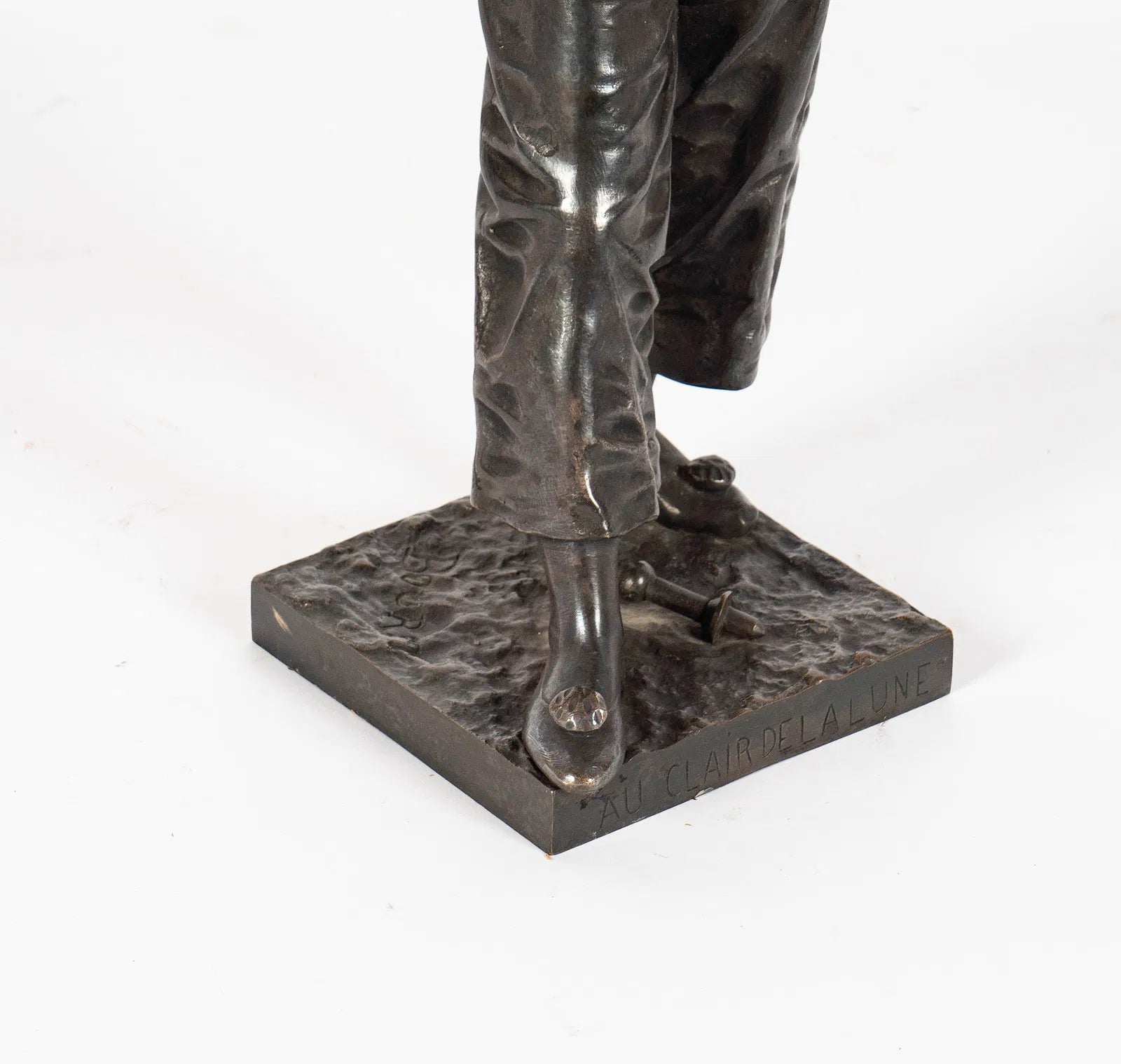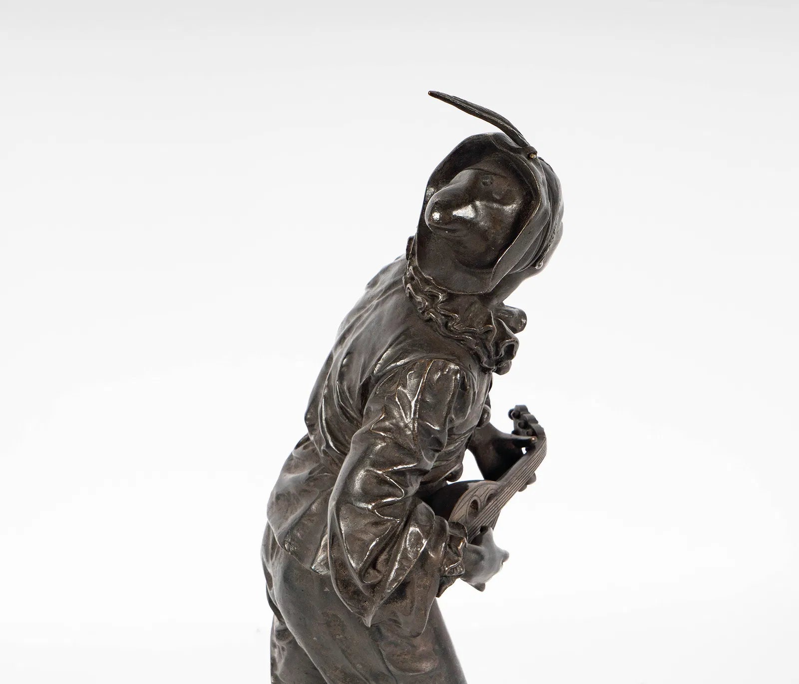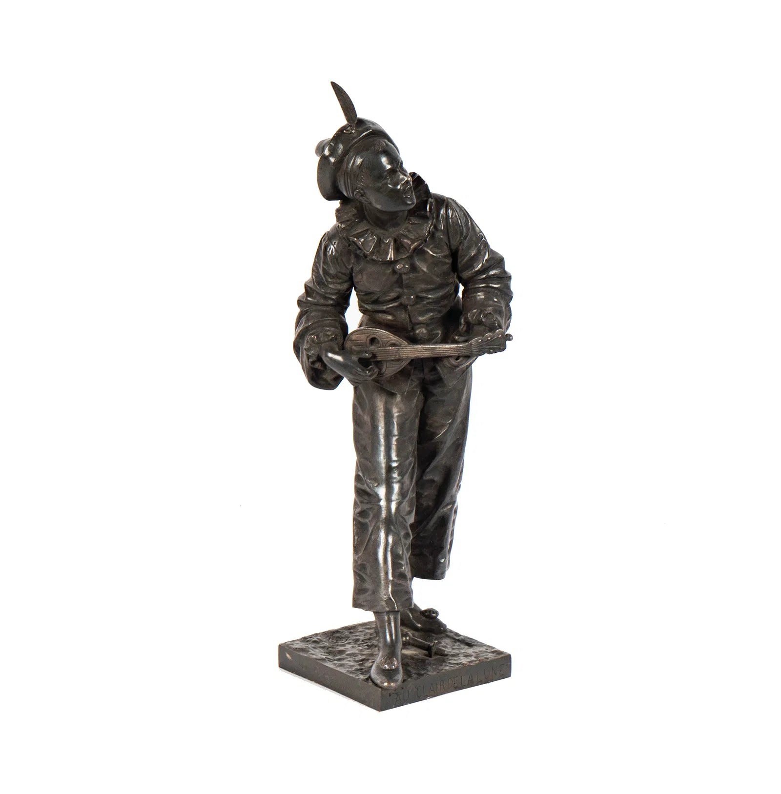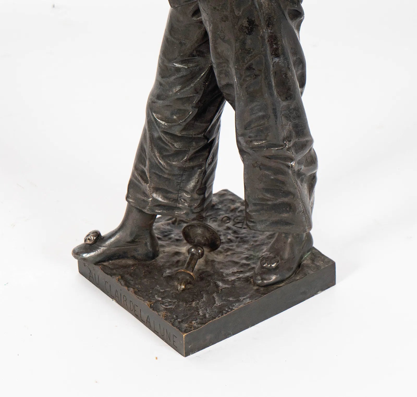 This finely modeled bronze sculpture captures Pierrot, the wistful clown of French commedia dell’arte tradition, playing a serenade under the moonlight. The title, Au Clair de la Lune, refers to the beloved 18th-century French children’s song, echoing the emotional solitude and romantic longing often associated with the Pierrot figure.