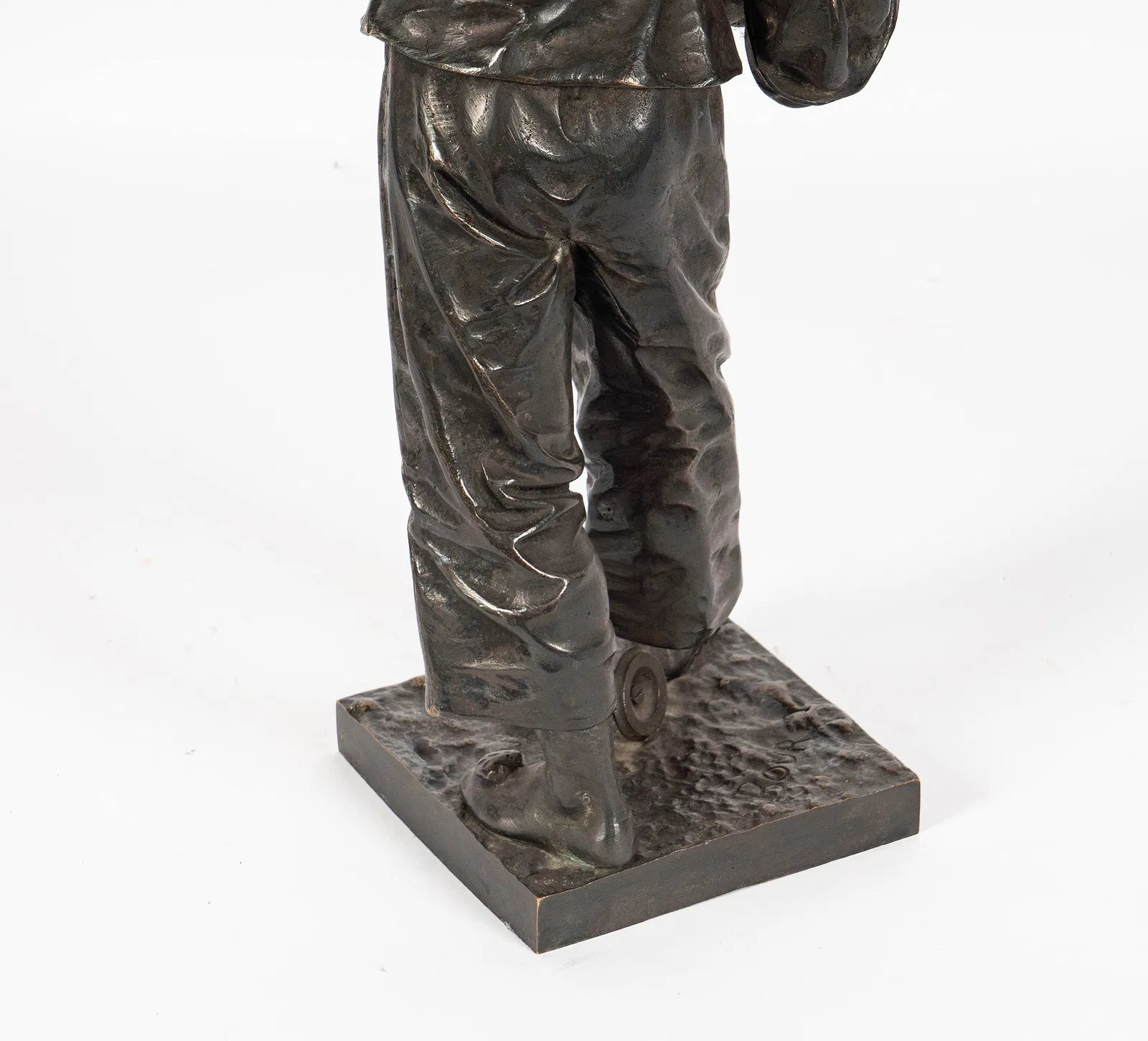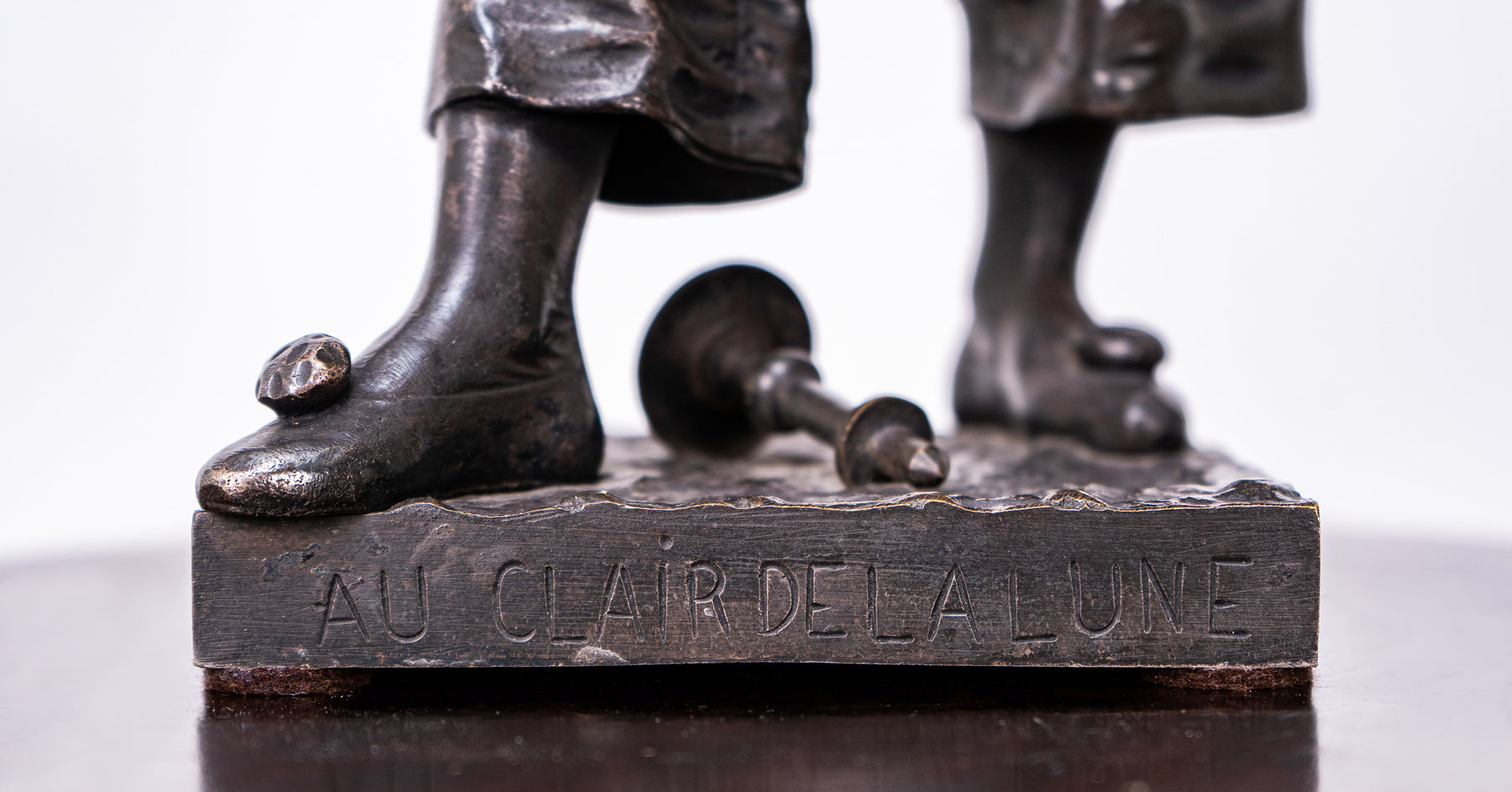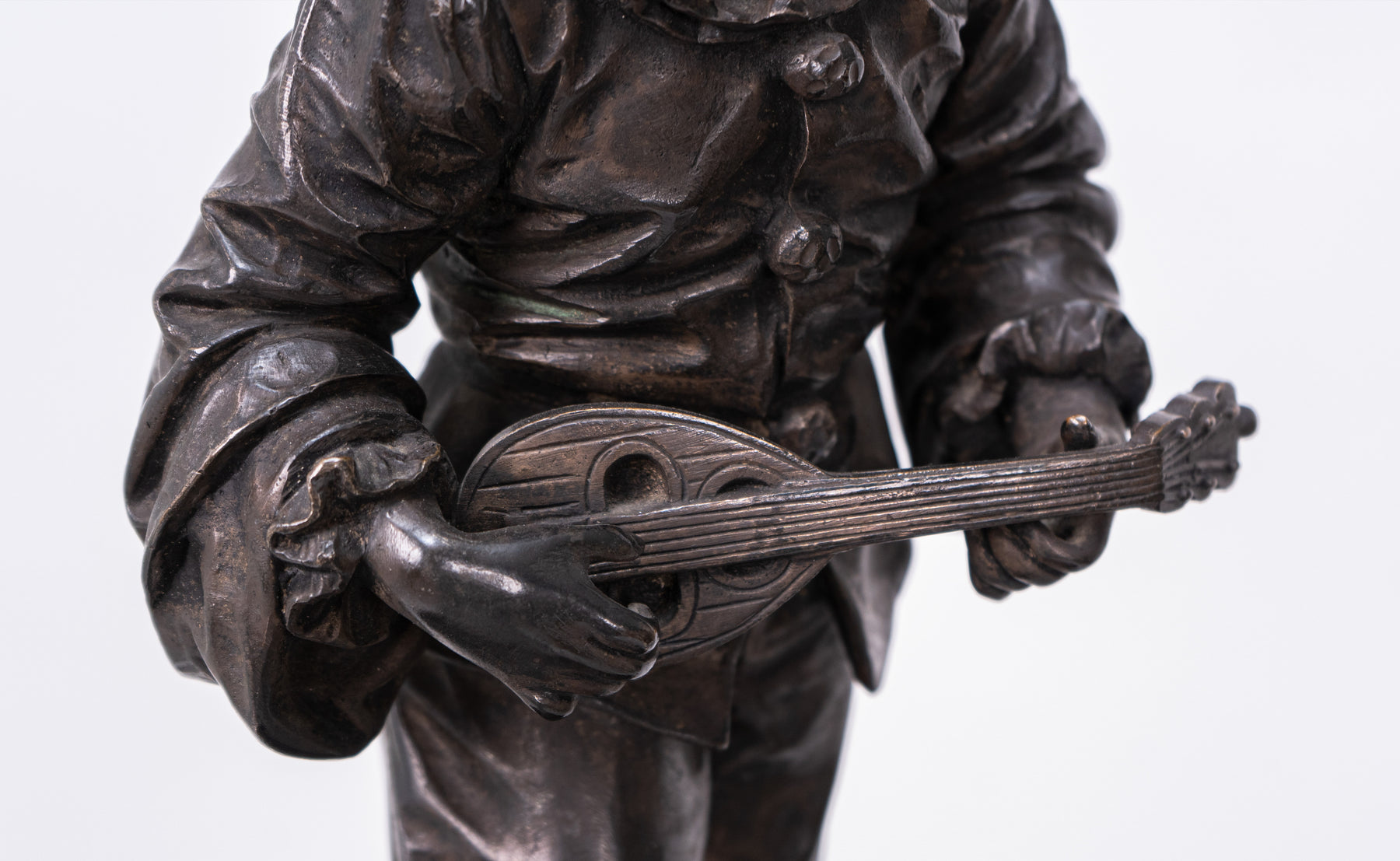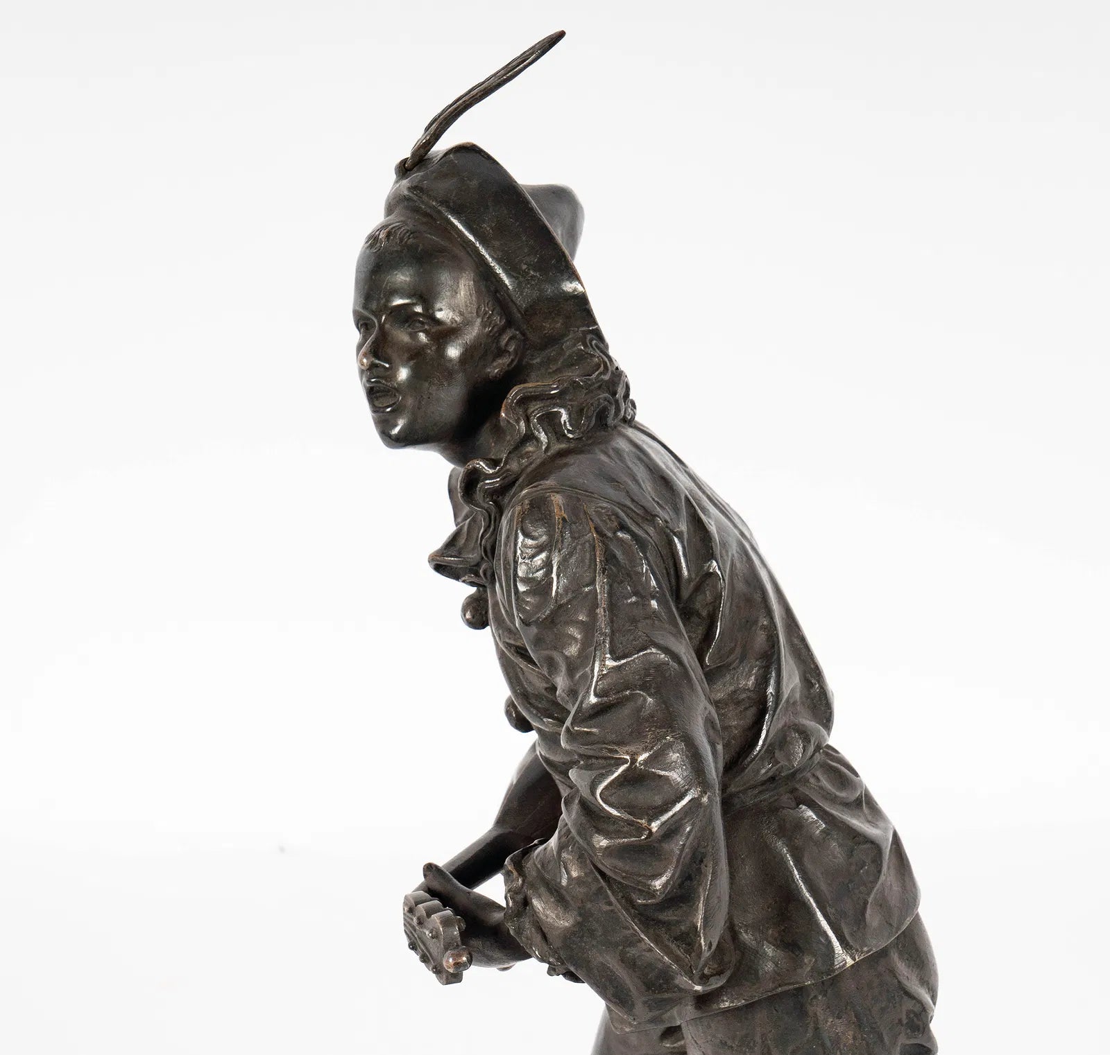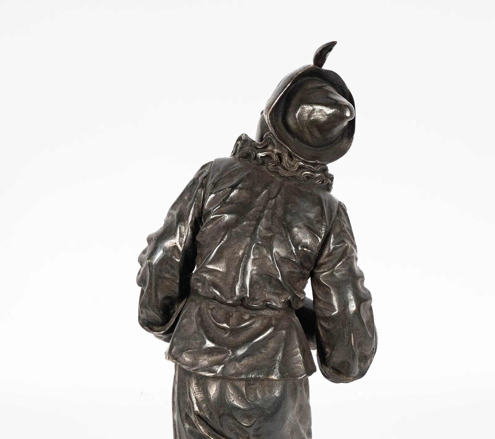 This finely modeled bronze sculpture captures Pierrot, the wistful clown of French commedia dell’arte tradition, playing a serenade under the moonlight. The title, Au Clair de la Lune, refers to the beloved 18th-century French children’s song, echoing the emotional solitude and romantic longing often associated with the Pierrot figure.
