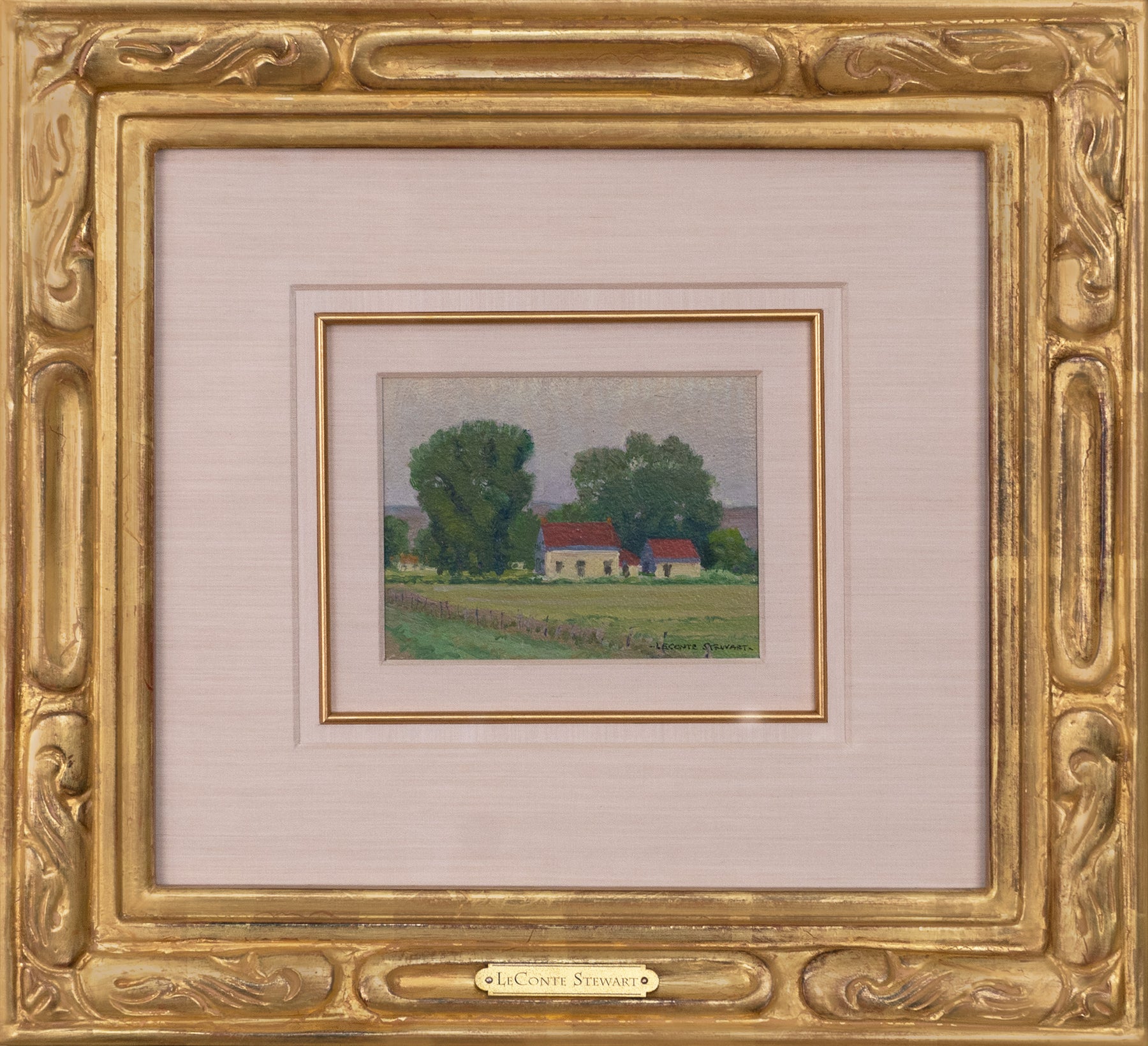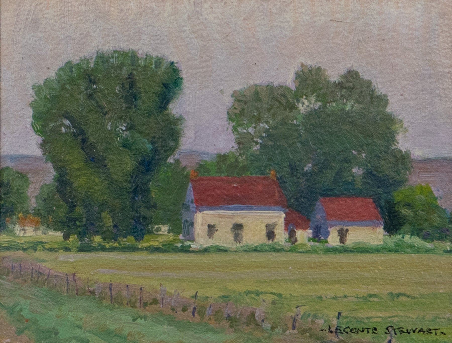 Though modest in scale, this painting exemplifies LeConte Stewart’s gift for transforming ordinary rural scenes into enduring works of art. The simple farmhouses with their vivid red roofs sit quietly among sheltering cottonwoods, their geometric forms contrasting with the softness of the surrounding landscape. The composition distills Stewart’s plein air practice—direct, economical, and grounded in close observation.