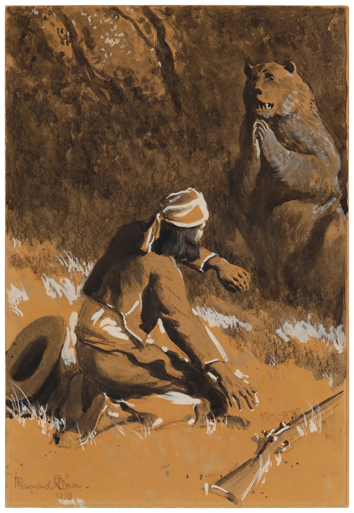 Maynard Dixon (American, 1875–1946) Hunter and Bear, 1916 Gouache on paperboard 16 × 11 in. Frame: 23 ½ × 18 ¼ × 1 ⅝ in. Signed and dated in pencil, lower left: Maynard Dixon / 1916 Also titled Surprised by a Bear on an alternate frame label