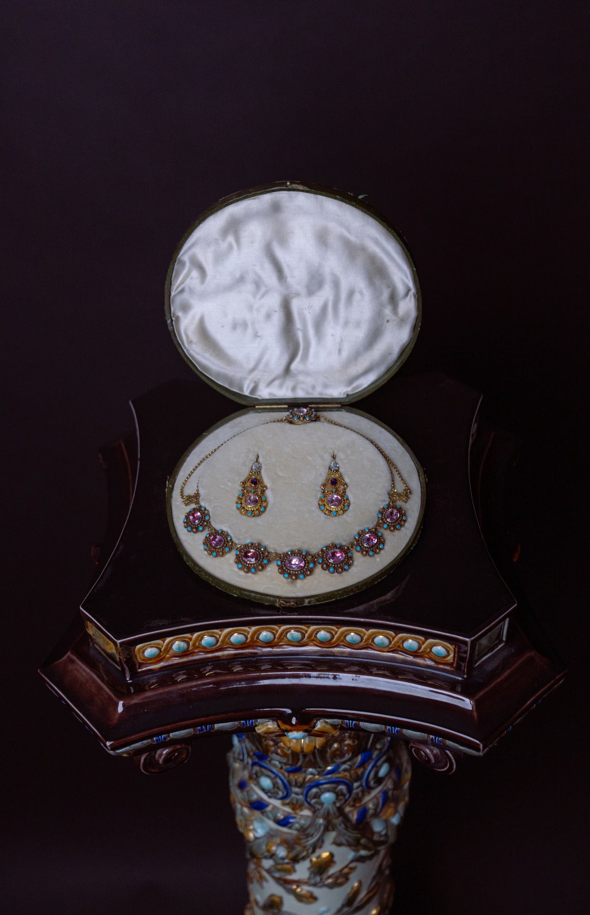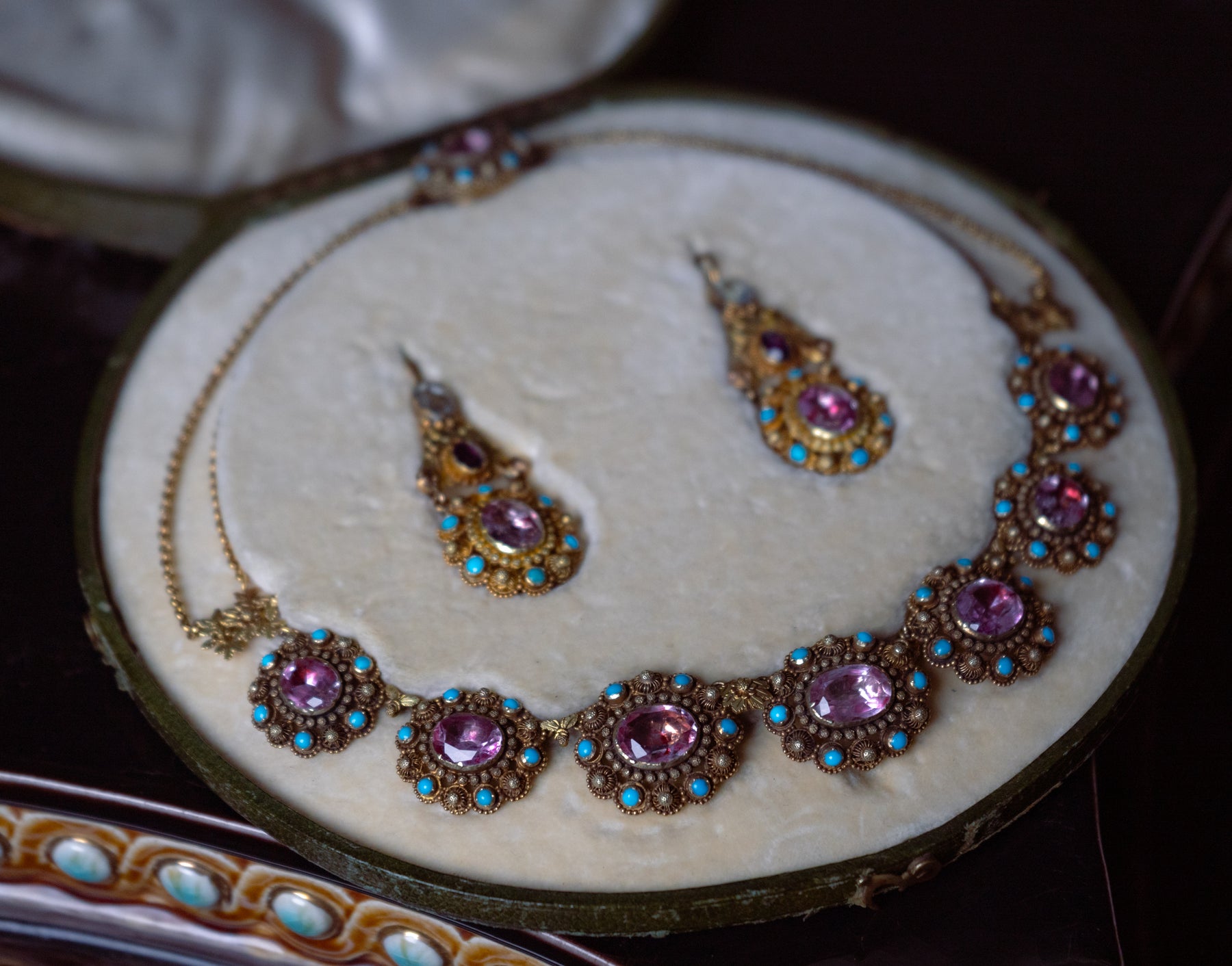 This finely worked demi-parure comprises a necklace and a pair of earrings, executed in 18 karat gold with elaborate cannetille-style decoration. The set is centered by ten oval mixed-cut pink topazes totaling approximately 24.00 carats, complemented by two oval mixed-cut amethysts (approx. 0.55 carats total), one oval mixed-cut colorless topaz (approx. 0.75 carats), and one oval mixed-cut aquamarine (approx. 0.80 carats). Round cabochon turquoises, measuring approximately 2.00 mm in diameter, provide vivid chromatic contrast and reflect the Romantic-era taste for color and ornate surface detail.