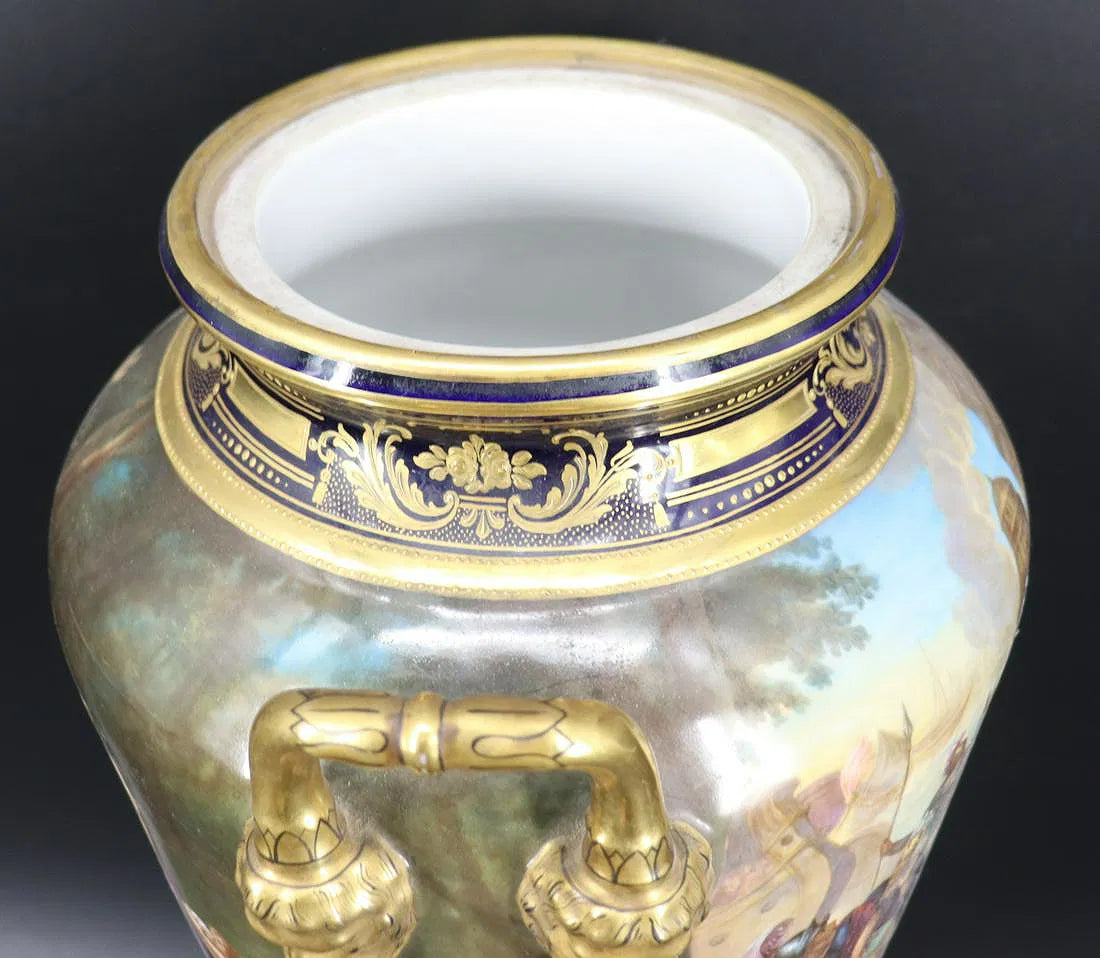 This monumental lidded urn exemplifies the peak of Royal Vienna porcelain production during the late 19th century. Centered on the vessel’s body is a hand-painted neoclassical scene, possibly inspired by Roman military history or theatrical spectacle, rendered with luminous color and intricate brushwork. The pedestal base features another finely painted composition—perhaps a mythological allegory—set within an arched cartouche.