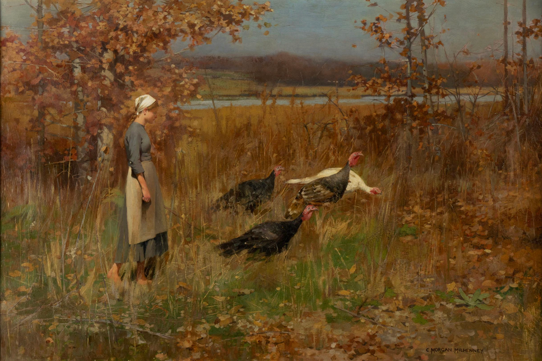 A quiet study of rural life, The Turkey Girl exemplifies Charles Morgan McIlhenney’s sensitivity to atmosphere and his naturalistic approach to figure and landscape. The painting depicts a young farm girl tending a small flock of turkeys amid the muted hues of late autumn. The subdued palette of russet and gold, softened by the misty distance beyond, evokes both the serenity and solitude of agrarian existence. McIlhenney’s brushwork alternates between delicate precision in the girl’s features and a freer, more impressionistic handling of foliage and ground, creating a gentle rhythm between human presence and the surrounding natural world.
