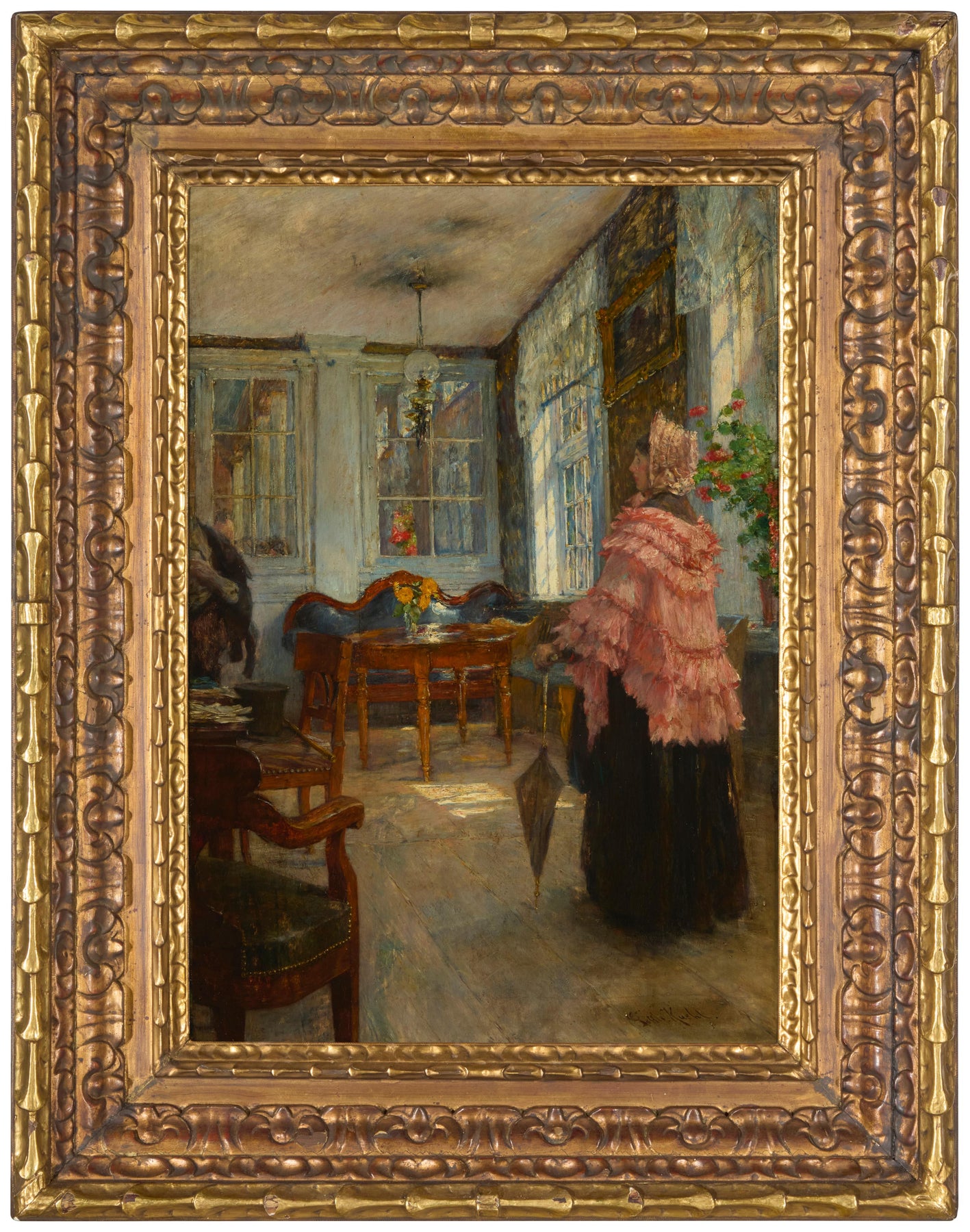 This intimate interior depicts a solitary woman paused in a sunlit room, her parasol lowered as daylight filters through tall windows and glances across polished floors and furnishings. Kuehl emphasizes quiet observation rather than narrative, allowing the play of light, reflection, and texture to shape the scene. The ruffled cloak, umbrella, and carefully arranged furniture suggest bourgeois domestic life, while the loose, atmospheric brushwork softens edges and heightens a sense of fleeting presence.